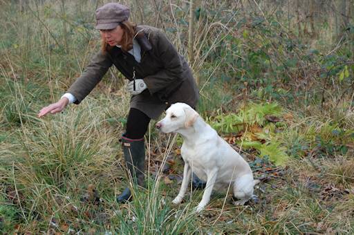 | Ann with her yellow bitch Bella teaching her to head off in the right direction for her retrieve. | |
