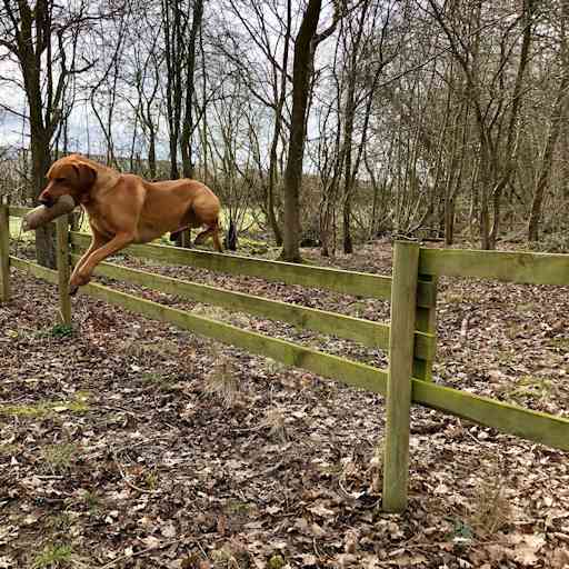 | Andrew with his fox red dog Ralph | Video clip of Ralph jumping training fence | |