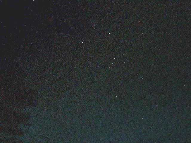 Orion 19:24UT 15/1/98 16s Kodak DC-120 (best compression) sampled to 640x480 to save time on downloading. Single hot pixels are best examined on the original 1280x960 image in uncompressed mode. If you look carefully at this original image you can find quite a few CCD hot pixel stars. You can also see more structure in the corner glow effect as radial striations and colour fringes. Fortunately they are reproducible on every exposure so they disappear when the dark frame is subtracted leaving only the real stars. All stars down to 5th magnitude are fully recorded, and it becomes more patchy in the 5.3-5.8 magnitude range with some recorded and some not (presumably a colour bias).