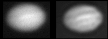 Original image J24-1 barely shows the equatorial belts, but when deconvolved shows some belt detail.