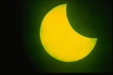 The following images were taken during the last partial eclipse visible from England and show the point of maximum obscuration by the moon. Unfortunately, the clouds were ever present and all shots were through a thin veil of high cirrus combined with some lower cumulus. The lens is a 1000mm f10 mirror lens of Russian Maksutov design used in combination with a full aperture front element solar filter and a 2x teleconverter to get optimum plate scale. The images are full frame slides on Fujichrome Sensia 100 scanned onto Kodak PCD.