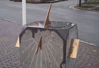 An unusual modern sundial in the town square at Rupelmonde not far from the tidal powered grain mill. It was raining very heavily at the time so it was not possible to check it for accuracy. The granite post had the correction for the equation of time engraved onto the side.