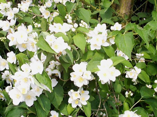 The next unknown is a tree like plant with long vertical branches covered in very simple white flowers with yellow stamen. The flowers are pure white against clear green foliage and the perfume is excellent. I think it may be a variety of Philadelphus delavayi.