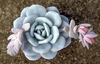 Echevaria lauii is one of the most beautiful of the Echevarias and has a very fine waxy blue white bloom on all the succulent leaves. It almost reaches out an says "touch me" to passers-by. This is very unfortunate as the bloom is soft and easily damaged by the lightest touch. Leaves have a tendency to come back from a show with the culprits fingerprint imprinted on the edge of a leaf. It is very symmetrical and pretty whether or not it is in flower. Definitely one of my favourite plants and has kindled my interest in other plants with similar forms of rosette.