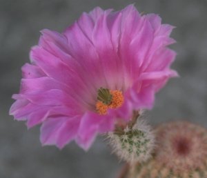 A handsome echinocereus with highly coloured regular spination and magnificent trumpet shaped shocking pink flowers which can be 3" across.