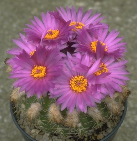 I quite like the group Notocactus, which includes many easy to grow and free flowering species. They are globular or short columnar plants from South America now lumped with Parodia. Most have large yellow flowers and grow easily. A few are a bit more tricky. Some of the nicest plants have unusual blue grey bloom or purple magenta flowers. The magenta colour is particularly hard for colour films to render accurately. Some Notocacti clump up to form an impressive group when they get older, and others have the irritating habit of becoming corky from the base. They do give excellent displays of flowers from relatively small plants.