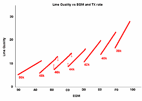 Note also that "line quality" is not simply related to data rate. A line quality of XX at a higher rate indicates a better quality of line. The EQM is a much better if slightly noisy guide to your true line quality. The question of how "Line Quality" relates to EQM is interesting and illustrated in the graph below.