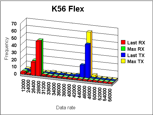 The graph is based on approximately 100 calls to the Demon K56Flex enabled Ascends using a mixture of Pace 56k and Hayes 56k modems. No obvious distinction in raw connection speed was noticed between the two. The vast majority of connections using modem defaults were at TX 26400 and RX 46000, but by S91 tweaking I was able to get TX 28800 rates most of the time. A few K56 connections dropped to the ludicrously low data rates of TX 12000 RX 12000 for no obvious reason (perhaps a firmware glitch?). Note that about 30% of calls drop to RX 44000 and a few drop to 42000 and 40000 in an exponential tail. K56Flex never seems to negotiate to higher rates than the initial connection.