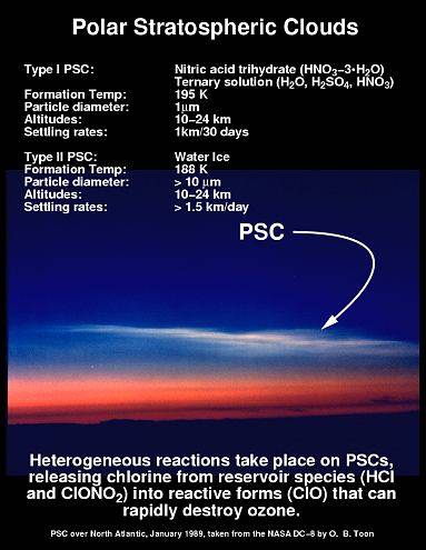 When they occur in the Arctic or Antarctic regions they are called polar stratospheric clouds and are being studied by various groups including NASAs SAGE III Ozone Loss and Validation Experiment, SOLVE. It is the finer Type I PSC's consisting of nitric acid trihydrate which give the spectacular colourful displays. It is the very fine particle size which gives rise to the colourful diffraction effects. Both sorts of cloud can accelerate the destruction of ozone. The graphic of characteristics of PSCs Copyright © 1989 O.B. Toon is reproduced here by kind permission of the NASA Solve group. |