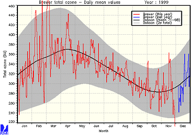 The clouds also provide a platform for the chemical reactions that deplete ozone and the ozone layer crippled shortly after the November display before recovering to normal levels again. There was briefly an ozone hole over Europe arising from the accelerated ozone depleting reactions which occur on the cloud particles. The trace from Brussels Royal Meteorological Observatory at Uccle shows the catastrophic effect this display had on ozone levels - driving the ozone concentration briefly down to about 200 DU well below the normal level for the time of year (grey band). |