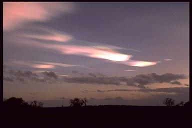 There was also a very large brilliant white cloud of the same type directly overhead, but it was far too big to photograph sensibly. The edge of the biggest cloud (which just had pretty fringes) but was overpoweringly bright is visible on the top left corner. I have some continued observation on video, but it is very poor as the camera interprets bright colours in the contrasty sky as white. The increasing amount of low dark cloud, and failing light together with high winds meant that I stopped taking slides when exposures increased beyond 1/30s (this may have been a mistake) The video covers a range of 17:40-18:20, but much of the interesting detail is lost behind foreground cloud. The final salmon pink cloud showed quite well on the video, but I didn't take a slide. If I had realised how rare this event was at the time I would probably have taken many more slides!