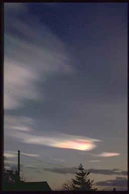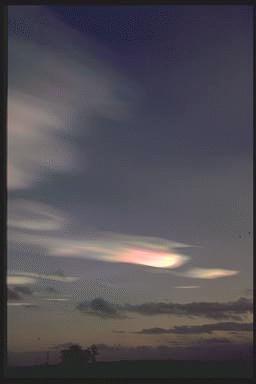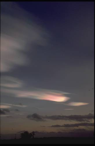 27 - 17:37 good horizon, to show cloud details and periodic structure in the cloud behind the bright colourful one. Colours are still highly developed, but hard to see on the print. The blue/purple leading edge spike of the main cloud sticks out a long way. Auto exposure -1 stop (f2 1/30) |
