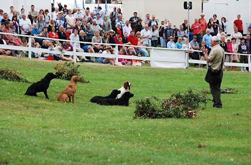 A typical show day would be two half hour ring displays, times to suit, but we are flexible and can change to fit in with your arrangements. We normally bring about eight dogs, some fully trained, some partly trained and one or two untrained. This allows us to demonstrate how a trained gundog team works together. Then we can show the basic steps of training young dogs and puppies at various levels of training. We find this is always a good crowd puller as the training for young gundogs is the same as for a pet dog. Also if time permits we like to involve children in the display. My granddaughter loves helping with the dogs and wants to be a vet. Mountgrace Gundogs Training Video.