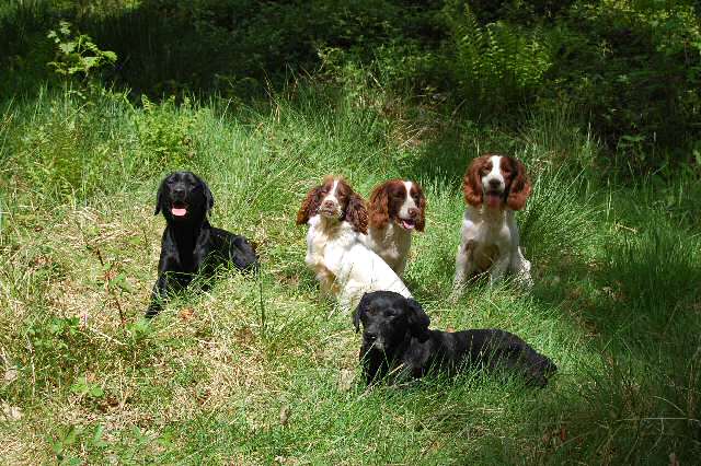 In June this year I will have a small number of spaniel puppies for sale in June/July from top class working stock. A selection of new photographs of dogs and their owners working together at our woodland training ground. Dam is Loxy (black). Sire of the puppies is Glen (fox red). Both parents are hip and eye tested and bred from field trial champions. Puppies arrived 7th July. Two black dogs from the litter are available. |